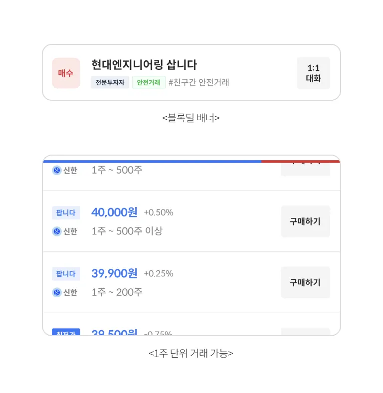 기존 비상장 시장에서의 직거래 형태 거래 방식을 획기적으로 개선하여 개인정보 유출 및 거래 위험성을 해결했습니다.
